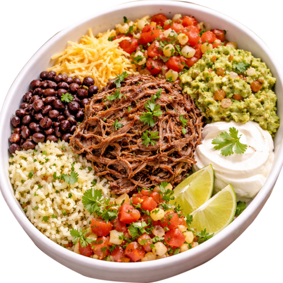 A delicious bowl with your choice of steak, chicken, or birria, served with rice, beans, cheese, salsa, pico de gallo, guacamole, and sour cream.